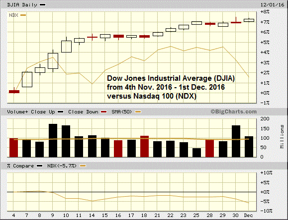 In the following chart please check out the divergence between the Dow Jones Industrial Average versus the Technology-Sector-Index, aka NASDAQ-100 in the timeframe 4th Nov. 2016 up to 1st Dec. 2016 - and compare it with the statistics-box above.