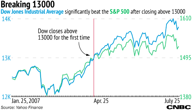 Take a look at one example from mid 2007, when the Dow closed above 13,000 for the first time. You'll see specifically how the Dow then took off relative to the S&P 500, outperforming by almost 4 percent in just three months: