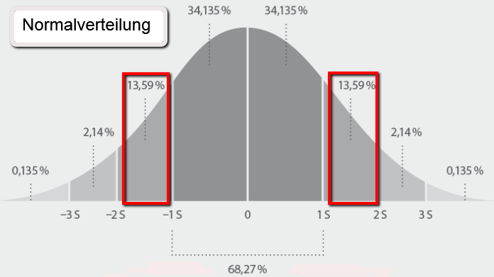 Auf Basis der Normalverteilung wird erwartet, dass an 27,18% (zweimal 13,59%, rote Kästchen) der Handelstage die Bewegung zwischen einer und zwei Standardabweichungen liegt. In diesem Beispiel bedeutet dies eine Bewegung zwischen +1% und +2% und -1% und -2%. An 4,28% (zweimal 2,14%) der Handelstage wird beim Aktienkurs eine Bewegung zwischen +2% und +3% oder -2% und -3% erwartet. Schließlich wird an 0,27% der Handelstage eine Bewegung mehr als jeweils +3% oder -3% erwartet.