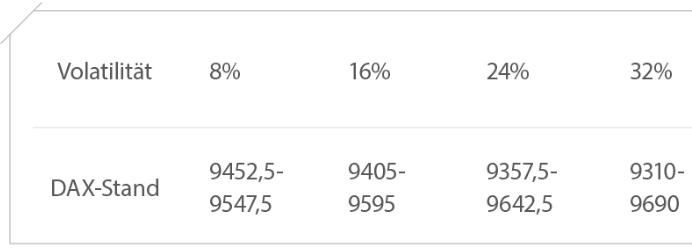 Veränderungen in der Volatilität von Optionen und dem Kurs der Aktie finden ständig statt und führen zu neuen Werten und Erwartungen. Um dies zu illustrieren, gehen wir der Einfachheit halber von einem Stand des DAX-Index von 9500 Punkten aus. In der folgenden Tabelle ist zu sehen, dass mit der Zunahme der Volatilität des Index der Bereich der möglichen Schlussstände des DAX-Index am betreffenden Handelstag größer wird.